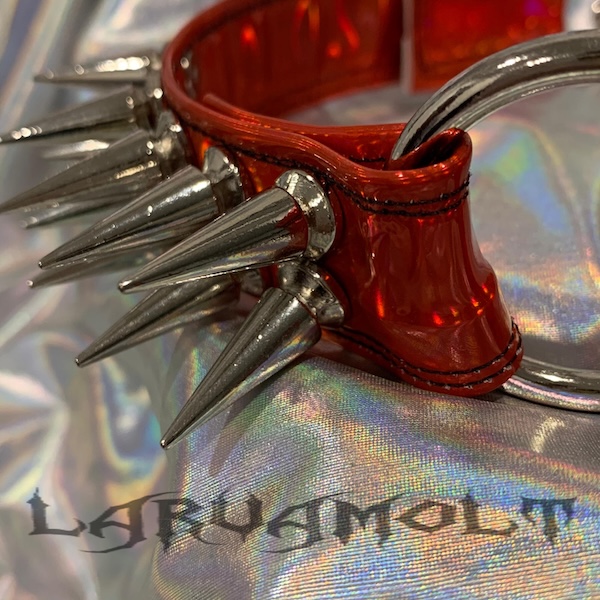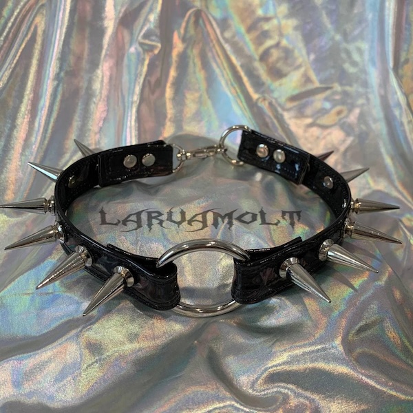PU leather (vinyl) spiked collars, harnesses, and keychains I hand-hammer-riveted.